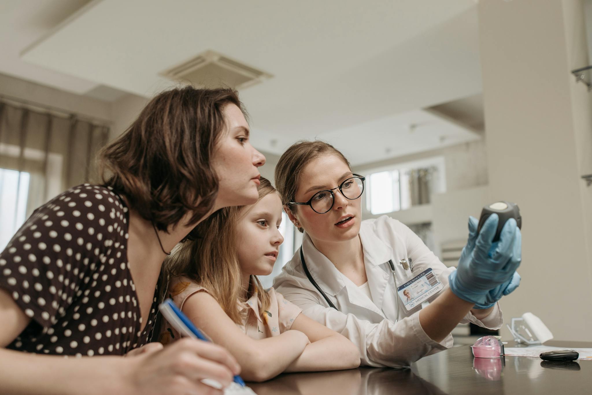 A doctor explains a glucometer to a mother and child in a clinic setting indoors.